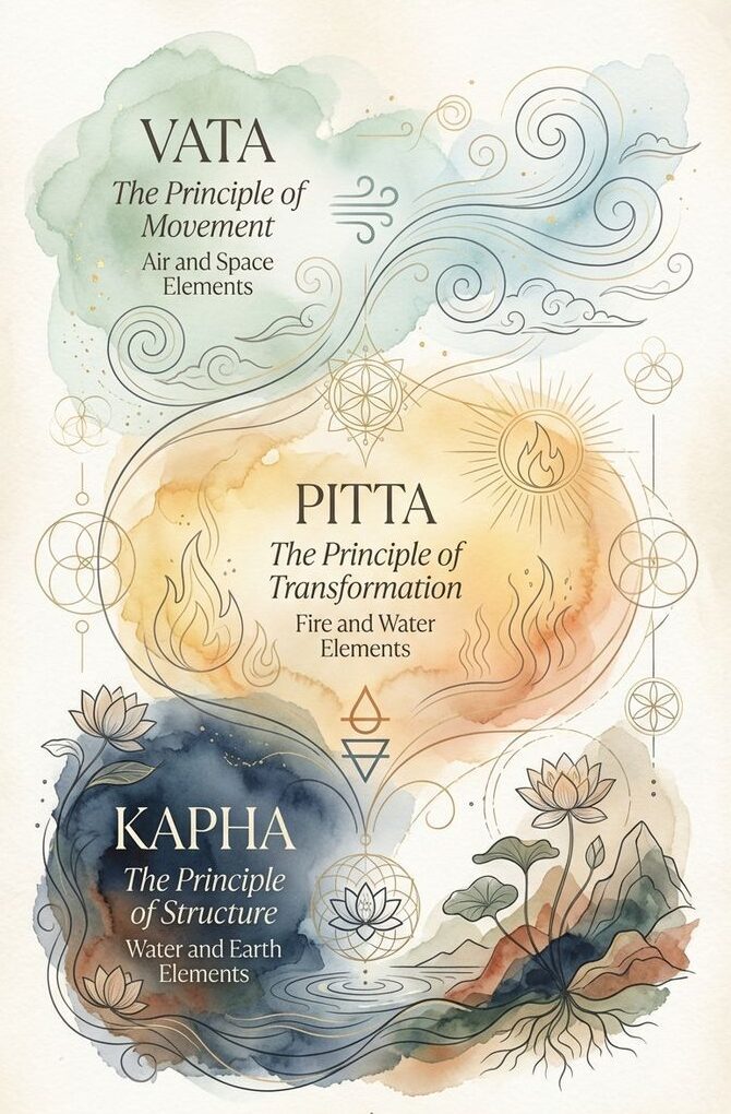 Vata (Air & Space): The energy of movement. It governs breathing, circulation, and the nervous system. When balanced, it fosters creativity and vitality; when out of balance, it can lead to anxiety, dryness, and digestive issues.