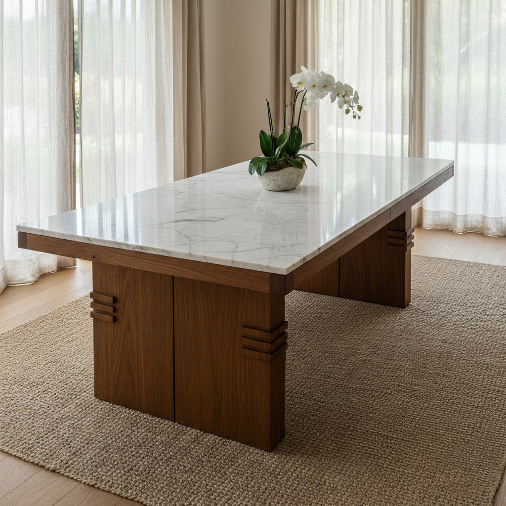 The combination of natural wood and marble makes this dining set both functional and visually impressive, suitable for modern as well as classic interiors.